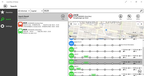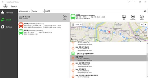 This application provides information for intra-city buses of South Korea. Also you can get the bus routes, stops, real-time arrival information for intra-city buses and pin them as favorite items, and later you can get them easily. In this version, supports only for sevent provinces as below: - Capital area (Seoul city, Gyeonggi-do province and Incheon city) - Daejeon city (Gyeryong city included) - Busan city (excluded Gimhae and Yangsan city) - Gwangju city - Jeju-do province The one thing you must know is that all bus routes and stops would be displayed with Hangeul(Korean characters) even though the language setting is for English. * If you have problmes in installation or usage for new version, please remove previous version and then reinstall with new version. * For Windows 10, the app stability would be increased if you hide the map from [Settings].