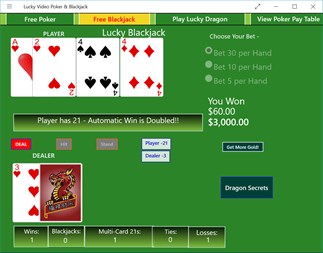 Lucky Video Poker & Blackjack is a collection of 3 casino-style games: Game #1 Lucky Dragon" This game is an exclusive variation of casino video poker, you can play three different hands of poker at once, or try your luck with three of the same dealt hand. You control the difficulty -- you choose how many Lucky Dragons (wildcards) appear per deck, from zero to four. The odds for wild cards are exaggerated, so you are sure to win at this fun adaptation. Free! Game #2 -"Lucky Video Poker" is a 2-Handed game with Las Vegas odds that simulates a Video Poker slot machine. Start with 3,000 credits to play two hands of poker each round, with your wins or losses saved as you go. You can add 1000 credits to your balance at any time -- just click "Get More Gold". Free! Game #3 - "Lucky Blackjack" where you get a fast version of blackjack with slightly better odds as you play with unlimited funds. The Blackjack game is not your usual casino game, and has features that favor the player instead of the dealer. Free! Good Luck! The Lucky Dragon awaits you...