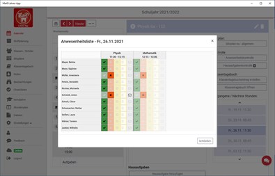- Kalender: Alle Termine auf einen Blick: Unterricht, Sprechstunden, Aufsicht, private Termine - Klar farblich gegliedert und einfach zu bearbeiten.