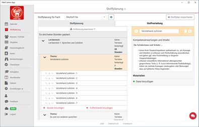 - Stoffplanung: Stoffverteilung und Unterrichtsinhalte für die Fächer mit Lernbereichen, Themen und Stunden - Automatisch mit den zukünftigen Unterrichtsstunden des jeweiligen Fachs verknüpft.