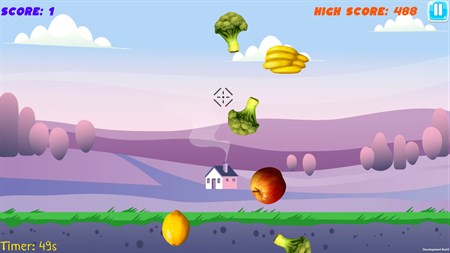 Let's training your shooting skill with fruits and vegetable. One day you will become real markman. Use mouse to control the cross hair and left mouse to shoot. Keep calm and shoot as much target as you can in 60s. Have fun and get your high score.