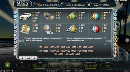 Mega Fortune is 5-reel, 25-bet line video slot with the largest online pooled jackpot on the market. In 2011 this slot has witnessed the biggest jackpot payout in the history. 20-year-old student from Norway has won €11.7M Mega Jackpot. Do you dream of becoming a millionaire? Then Mega Fortune is the jackpot slot for you! Mega Fortune’s progressive mega jackpot frequently swells to be worth millions! Play for free with bets ranging from €0.25 to €50 per spin. Mega Fortune offers one progressive jackpot potentially worth millions, five reels and 25 paylines. Mega Fortune features three jackpots – the rapid and major jackpots, and the big, progressive mega jackpot. To win the mega jackpot worth millions, match three bonus symbols, then match three arrows on the wheel of fortune bonus round to win the mega jackpot. The rapid and major jackpots (worth hundreds and thousands respectively) can also be won during the bonus mode, as well as some huge cash lump sums worth up to €3,750 each. Land two or more scatters to win up to €5,000.