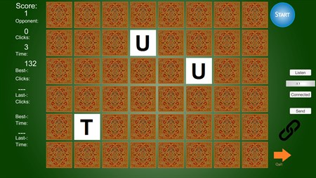 Find matching pairs of pictures of Characters of the Alphabet in as few clicks or time as possible (solo). Or Play Memory Game Alphabet via the internet, LAN or (wireless) home network with a friend. Connect: First type both the IP address in the inputfield of your opponent during the Game.Then hit the [Enter] key. Then use both [Listen] to be clicked once during the process of making the Connection on both ends of the Connection in the two instances of the Program (required). Let you and your friend make sure you both typed in the IP address of the Player on the other end across the network in an inputfield and press both [Connect], virtually at the same time together. Some Modem Port forwarding Settings may be necessary for you to make (both only once, yielding for all of my internet Games then), to let this program work. See the manual on my website: https://hannopondaag.github.io and also discover your IP address there via a Link. UPnP IGD should be on. And make the rule for portforwarding in your Modems (only one rule for all of my programs required thus). Mind your Local IP Address corresponds with your setting on your Modem when using the WAN at a home network situation and set portforwarding then to use port 1200 on your Modem. No ads.