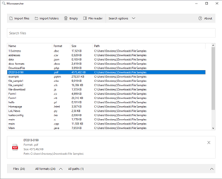 Microsearcher enables the user to search inside files for a specific search term. Once the search process is finished, those files that contain the search term will be visible and all other files will be hidden. The supported file formats are: DOCX, DOC, PDF, XLSX, XLS, CSV, PPTX, PPTM, ODT, TEX, RTF, TXT, HTML, XML, PHP, C, CPP, CS, VB, JAVA, JSON, PL, PY, JS.