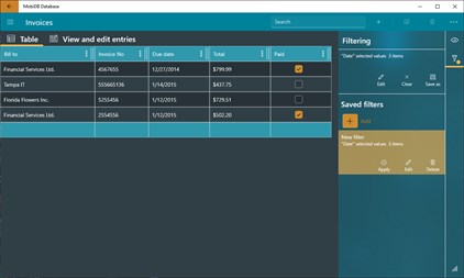 MobiDB Database is an offline database app with cloud sync. MobiDB is a best way to create database on PC and sync it with mobile platform of your choice Android or iOS. Cloud sync turns mobidb into team database and enables collaboration between devices and people. MobiDB is a perfect suit for field workers. It supports Geo GPS coordinates and suits for geologists, archeologists and etc. to track custom entries. With more then 20 field types you can keep track of any data and is a perfect tool to organize your life and work. It’s a nice tool for home inventory, customers database, invoices and also suits for managing spends, meter reading, controlling health sugar/blood pressure indicators, managing different types of collections. MobiDB is a relational database app, it supports OneToMany, ManyToOne and ManyToMany relations via nested child tables and table reference field. MobiDB is a Windows database app, but it also supports Android and iOS clients. They support the same features as Windows app and even some more. Several third party cloud providers are supported Dropbox, Google Drive, One Drive. Sync between your Windows database app and mobile devices seamlesly. Powerful csv import enables data exchange between mobidb and MS Access, Filemaker, Excel. With MobiDB database app for Windows you will be able to design complex relational databases with professional-looking forms, customized entries, complicated calculations and aggregation reports. Export to Excel, PDF and CSV allows the use of database information in external apps. Convenient cloud synchronization enables database sharing and collaboration. Intuitive visual form designer will help you arrange information on your screen in an attractive and readable manner. If you know Bento you will find our designer similar to the known Ipad app. Just drag and drop the required field types similar to Bento Ipad app (text, integer, float, picture, calculable, nested table, dropdown list, etc.), layout them on the form and set up relations. A set of pre-designed templates addresses some common database tasks, you just need to enter the records. Manage and analyze entries Convenient and highly-customized table view make it easy to analyze and manipulate database data. Reorder, hide/show columns, sort and filter by multiple columns, dynamically search for necessary information to make the table address your analytical needs. Accumulated balance reports are able to show the data aggregated from multiple tables and provide an exhaustive data view so, you are able to see your progress or possible issues. Enable teamwork and collaboration Upload your databases to cloud storage: Dropbox, OneDrive, and Google Drive, share with the other users for teamwork and collaboration. All changes and data manipulations will be synchronized across all users’ devices on Android, iOS and Windows 10. Use MobiDB Database Designer to * store personal information of your collections, recipes, to-do lists, etc.; * keep track of your business related data: customers, orders, products list, receipts; * manage projects, track tasks progress, assign responsible persons, and invoice customers;