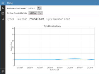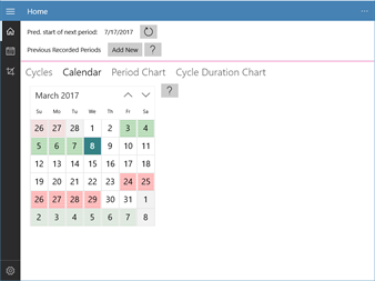 The easy app to track your menstrual cycles! Simply enter your period and this app will analyse how they differ from month to month. The periods you enter will be plotted in graphs and also on a scheduler where you can see predictions for your next periods (predictions are informative (and a guess) only, always use your own judgment to determine when your next period will start).