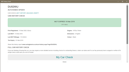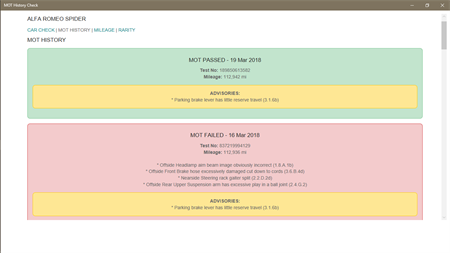 MOT History Check - Enter your registration number to view a history of all of your cars MOTs. Fails will show the parts it failed on as well as advisories. The mileage at each MOT is also shown, which is handy when buying a second hand car.