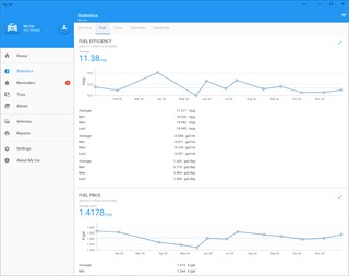 Key features: - Keep track of vehicle's costs, services and fuel efficiency. - Add photos to the vehicle album. - Add notes. - Attach photos and other documents to any event. For example attach a photo of the receipt related to the event. - View and search event history. - View statistics: fuel, costs, odometer. - View charts: fuel efficiency, odometer, fuel price, cost structure, monthly costs, monthly fuel costs, costs per odometer unit, costs per day, cumulative costs. - Support for multiple vehicles. - Supported fuel units: liter, gallon, kg, kWh. - Supported odometer units: km, mile, hour. - Support for several different fuel efficiency units including mpg, L/100 km and km/L. - Support for bi-fuel vehicles (e.g. gasoline/CNG). - Import data from other applications. - Modern, clean user interface and very easy to use.