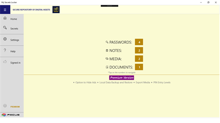 * Secure Repository of Digital Assets like Passwords, Important Notes, Images, Videos, Audios and Documents. * This App uses Windows native encryption to securely store your important data. * Backup and restore your data on your OneDrive Account! * Just remember App-PIN and confidently store your important data in the App. * Retrieve forgotten App-PIN by answering the Security Question set by you. * You can view Images, watch Videos, listen to Audios and launch Documents stored in the App.
