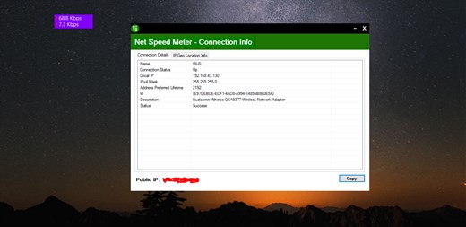 Net Speed Meter displays information regarding the Internet connection speed in plain sight, on your desktop. The meter is set to stay on top of all the other opened windows so that you don’t lose sight of the upload and download speeds.