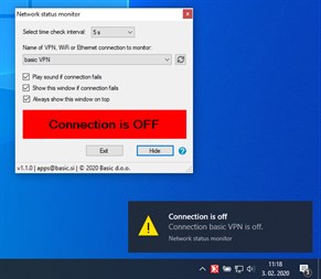 Do you work over VPN connection which sometimes fails without Windows showing you any notification? Do you want to get instant audio-visual notification if your Wifi connection turns off?