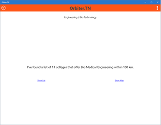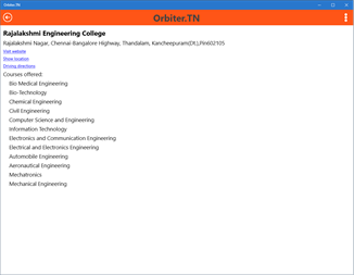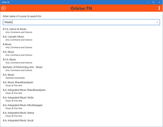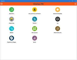Your search is optimized with Orbiter.TN 1. Ease your search – No Typing!!!!!! 2. Easily understand the options 3. Prompting multiple choices of courses / college 4. Easy to share 5. Connecting to Career and Professional Counseling Support A place for your intellectual appetite in searching the courses or colleges in the fields - ranging from Arts, Commerce, Dance, Music, Fisheries, Vocational, Engineering, Medical, Agriculture, Sports and Humanities. It empowers you to know the Institutions’ status - Government or Private, location etc.