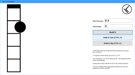 With Oscar's Chord Builder you can easily create images of 6, 5, 4, 3 and 2 string instrument chords. Simply enter the frets and click Build It.