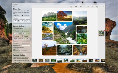 Easy to use • PhotoSheet Imperial and Metric paper sizes! All of the A's and B's and P's are there for your choosing! If your favorite paper size is not in the list, don't dismay: you can enter any sheet size you like, in inches or centimeters! • PhotoSheet remembers your settings from one session to the next! If you frequently use the same layout or sheet size, you'll love this. • The film strip holds all of the photos you're working with, and page views help you build multiple pages using the same layout! Create package prints for several photos at once! • Choose a different layout and automatically fill the open spaces with unused photos, or gather images together to use fewer pages! • "Remove" buttons on filmstrip items, pages, and layout cells make adjustments easy when you change your mind! • Images can be repositioned and resized inside their layout cells - Select the image first, then drag the image or roll your mouse wheel to zoom. If you have a touch screen, pinch or use two fingers to move or zoom the image.