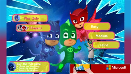 This is a "PJ Masks" themed version of the classical Memory card game. The object is to match more pairs of cards than the opposing player. If you're playing alone, instead you just have to match all the pairs in the shortest time possible.