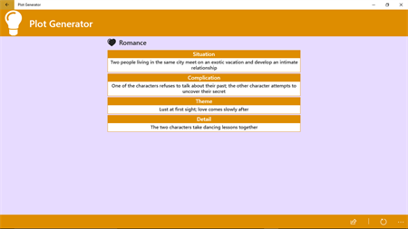 Story Plot Generator provides you with four key aspects of your story: a location or situation, a detail or event, a complication, and an objective. This application generates over 1 million possible combinations of these four aspects in various genres, giving you plenty of ideas!