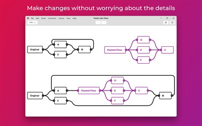 MAKE CHANGES WITHOUT WORRYING ABOUT THE DETAILS No matter what you change, the layout will automatically adapt. Paste a whole subflow into the middle of the flow. Delete any part of the flow, no matter how intertwined. You won’t have to spend most of your time fixing the layout.
