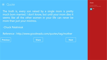 This app is dedicated to mothers and people who want to read about mothers. It provides quotes on mother from several authors in a single place with references. Users can read and think of perhaps the most beautiful person in their life - MOTHER. This requires an internet connection.