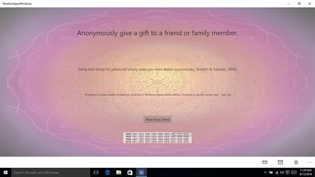 The Random App of Kindness application is designed to spread, encourage, inspire, as well as help provide ideas for random kind acts. Committing random acts of kindness can not only make you a more likeable person, but it also helps increase positive feelings about yourself and your ability to help, all while improving someone else’s day! It can help increase your overall confidence in your ability to help and has also been shown to increase your happiness levels! Random acts of kindness can range from small deeds, such as giving a compliment, to large acts, such as volunteer work and donations. The best part is that all forms and ranges of kind deeds benefit both the recipient and the giver. The most difficult thing about doing a random act of kindness is usually finding ideas of what to do. That is no longer problem with this app. With this application you are given a new kind deed to do daily, along with pop-up reminders. If the kind deed for the day doesn’t suit you, we have provided an option that allows you to pull up a different idea. In addition to providing ideas of kind acts, we have also provided you with some research backed information as to how committing an act of kindness can benefit you, along with a famous quote about kindness that you can share through email.