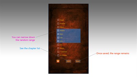 This app helps your desire to read bible every day a little more than a verse by randomly suggesting a titled chapter.
