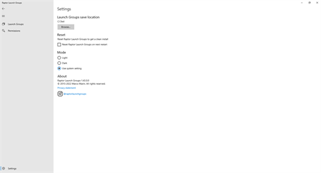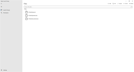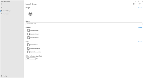 Please note the following: - Before adding Launch Groups, you have to choose a save location in Raptor Launch Groups settings - Before launching folders and files, you have to add the folders that contain them to Raptor Launch Groups permissions - Some file extensions are not supported including, but not limited to: .exe, .bat, .cmd, .msi, .js, .url