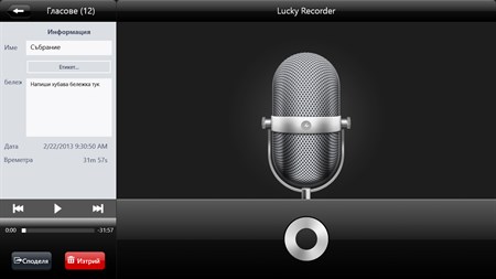Lucky Recorder е професионален диктофон. Тя е проста, забавна и лесна за употреба аудио и диктофон. Използвайте го, за да записвате срещи, лекции и лични бележки, без времеви ограничения. Можете да възпроизвеждате и да споделите вашите записи.