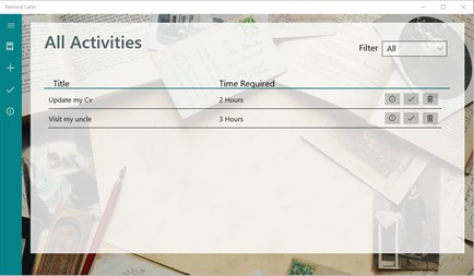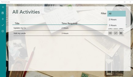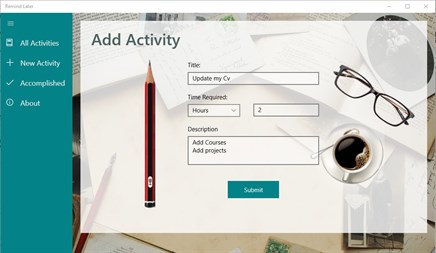 Remind later app helps you to perform activities that you don’t have time to accomplish at the moment and plan to perform later on, by suggesting one of those activities for you to perform, based on your spare time.