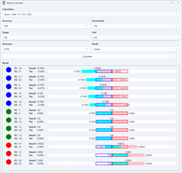 Select the resistors from E6, E12, E24, E48, E96 or E192 series. It could calculate the series connection,parallel connection,ratio and etc.
