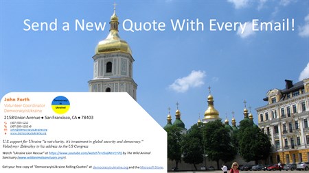 DemocracyIsUkraine Rolling Email Quotes helps raise awareness of the War in Ukraine with every email you send. Awareness that is Key in our Polarized World. Rolling Quotes inserts inspirational quotes into your email signature and raises awareness of Russia's war of aggression in Ukraine, the Ukrainian fight for democracy (both theirs and ours), the aspirations of the Ukrainian people and the work of non-profit organizations trying to relieve the pain and suffering in Ukraine. This app runs in your system tray where you can configure your rolling quotes and copy them into your clipboard for insertion into any e-mail. Get the DemocracyIsUkraine Outlook Add-In to automatically insert your quotes into your customized Outlook signature files as well. Photos courtesy of https://www.goodfreephotos.com.