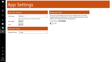 Site Up is a simple utility for Windows 10 useful to monitor and log the current status of your websites. It measure and record the ping time or the http status code, for example. You can view these statistics and apply two different criteria: time (today/this week/this month), or http status code. You can export the statistics of each website in a CSV file: you can open it with Microsoft Excel or others compatible software. But Site Up does more. It monitors your websites using also a background task: while you're working or playing, Site Up is awake and running. It continues to run without getting bored you (you can enabled or disable this functionality inside app settings). Site Up updates the main Live Tile with the latest diagnostics informations about your sites.