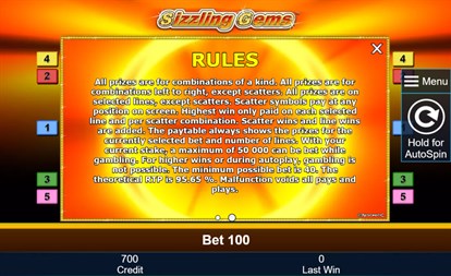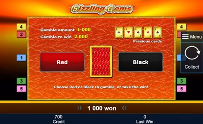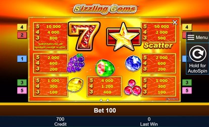 See the casino heat up when you play Sizzling Gems. Here, the fruits aren’t to be eaten as they are adorned with sparkling gems that will fill your account with great riches. In Sizzling Gems the 7s are encrusted with rubies and the stars are made from the purest, light yellow diamonds. To reap shiny rewards all you have to do is to arrange the fruits made from gems in the right order and decorate it with a sparkling 7 or a star and a basket full of winnings is yours! The aim of Sizzling Gems is to land 5 matching symbols side by side along 5 win lines. The winning patterns run from left to right. The Red 7 (Joker symbol) substitutes all symbols except the Star (Scatter symbol). The Scatter symbol replaces any symbol except and complements your winning combinations.