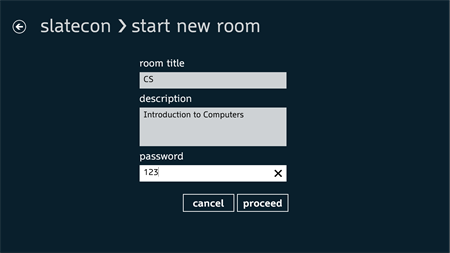 slatecon is the the real-time application for windows 8 platform that is used for an educational purpose. It contains a plain white canvas in which a user can draw anything from touch, mouse or pen and share that with the connected users. When the user opens up the application, it shows the active rooms and the user can connect to any room by entering a name, email address and password. If any user wanted to share something, he/she can create a new room and start sharing information.