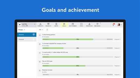 ✓ corporate messenger that allows you to communicate with employees and external partners; ✓ visual storage for contacts, divided into groups and by priorities; ✓ projects with any nesting degree; ✓ individual and team goals; ✓ easy approval of documents (service notes); ✓ flexible access rights, time tracking and much more.