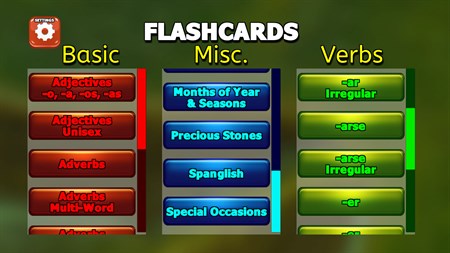 Version 1.00 has the following sections. More will be added in future updates: BASIC: Adjectives -oa -a -os -as, Adjective Unisex, Adverbs, Adverbs Multi-Word, Adverbs + de, Alphabet, Pronouns, Pronunciation & Questions. MISC.: Colors, Communication, Days of the Week, Expressions, False Spanglish, Greetings, Household Things, Key Words, Months of the Year & Seasons, Precious Stones, Spanglish & Special Occasions. VERBS: Action Verbs, Non-Action Verbs, -ar, -ar Irregular, -arse, -arse Irregular, -er, -er Irregular, -erse, -ir, -ir Irregular, & -irse.