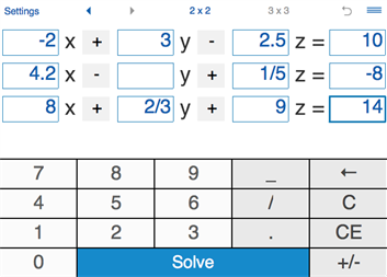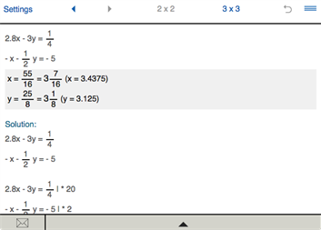 Features: Shows step-by-step solution. Supports integer, fractional and decimal coefficients. Shows results as decimals and fractions. Stores history with the possibility to recall previous equations. Sends results and history via email. Supports both portrait and landscape orientation.