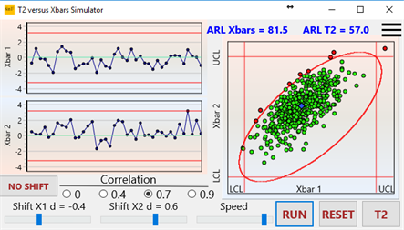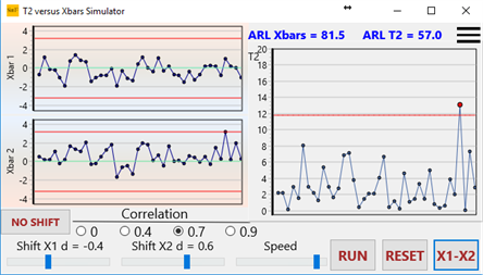 The software computes the ARL by simulation and it is possible to see in which cases the multivariate scheme is really more efficient that employing two Xbar control charts.