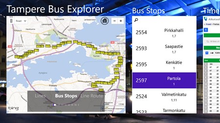 Tampere Bus Explorer provides buses locations, stops, schedules and routes. Bus locations are shown on the map in real time, updated every 2-3 seconds. Lines and bus stops schedules and monitors are also available. The application is specially designed for frequent users of city buses in Tampere.