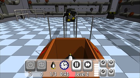 The Penguin Factory is a puzzle game with deceptively simple controls. The game contains a number of weird and wonderful contraptions, each of which can either be turned on or off, or can have its direction changed. And that’s it. Your task is to get every penguin safely into a delivery box by getting each piece of equipment working in the right way at the right time. When the delivery boxes are full, and any imposter penguins are "dealt with", your task is complete!