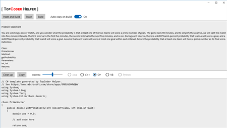 TopCoder Helper is a helpful tool for generating code template with test cases for TopCoder competition problems. Supported languages include C++, C#, VB. Java and Python will be supported soon.