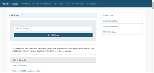 Note: Travel Guide App Trainspnrstatus is all in one rail inquiry app. It can help you check PNR status of your Indian Railways and IRCTC tickets. One can get train schedule with live running train status information. How to check PNR status using this app? It is very easy and simple. All you need to is to open this app. Once app is opened, you will find a form at the top. In the input box, enter your 10 digit PNR number and submit. Your current reservation status will be shown instantly. PNR is a 10 digit number, usually printed on top-left corner of your Indian Railway's counter ticket. If you have booked your ticket from IRCTC, then you can find this number on your electronically generated E-tickets. Also, IRCTC sends an SMS on your mobile phone in which all the necessary details regarding ticket is present. This booking SMS from IRCTC includes PNR number. You can locate it and use it to find current reservation status of your ticket. How to check time table of different trains? Indian Railways run thousands of trains daily. In order to check train schedule using Trainspnrstatus app, open this app and click on menu icon present in top right corner of the display. Once you click menu, it will show different links of the sections. Simply click on 'Train Schedule' option. Enter five digit train number and hit get train schedule button. After successful submission of train number, app will show you detailed time table of that train. From starting station to ending station, all scheduled time of trains are listed in table in chronological order for better understanding. Now if you need to check live train status, all you need to do is to select station and running days information from the available form on top. Clicking submit button will load live running status information about a train. Another great feature of this app is that it can provide you the list of all trains running between two important stations. After selecting 'Trains Between Stations' options, enter details of 'from' and 'to' in the form. Click 'Get Trains Between' button. It will load all the trains with departure and arrival time. It will also list train running days information. Distance between those two station and travel time will also be listed for better understanding. Apart from main features of Trainspnrstatus app like PNR Status, train schedule and live status; one can also check train coach position, Indian Railway map and station codes. Note: This is an unofficial Indian railways information app.