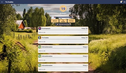 Adressquiz - Där användaren får namnet på en adress inom sitt lokala område. Därefter ska användaren gissa på kartan vart denna adress ligger, desto närmare man klickar, ju högre poäng. Poängen sammanställs och en topplista över Användare i området, länet och Sverige presenteras.