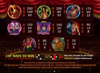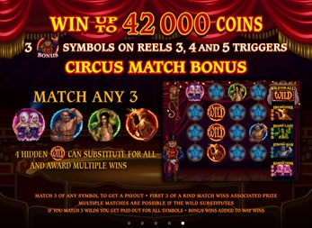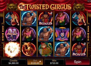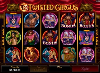 Roll up, roll up! Enter the big top to see the freaks and you could win over €111,000 in video slot, The Twisted Circus. Wilds, scatters, free spins and bonus modes await to help you win big sums of cash. Play for free with bets ranging from €0.30 to €120 per spin. The Twisted Circus offers maximum win on a single bet over €111,000, five reels and 243 bet ways. There’s no shortage of special symbols to aid you in your quest to land a big win in The Twisted Circus. There are wilds that can substitute for any regular symbol. Match three or more scatter tickets to win 13 free spins. Free spins wins are tripled. Match three ringmaster bonus scatters to enter the bonus mode, where you must select hidden symbols. Find three identical ones to win. Match two or more scatter tickets to win up to €4,800 or three or more wilds to win up to €1,200.