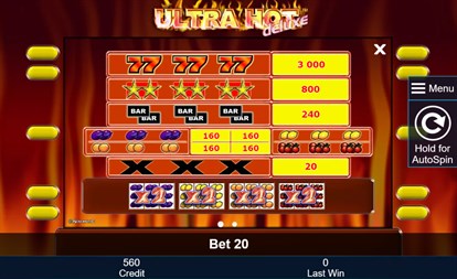 Ultra Hot Deluxe is an absolute classic among the slot machines! With its colourful fruit symbols it is entirely consistent with the flair of a typical ‘fruit machine’ or ‘fruity’, as one-armed bandits are often known. The symbols spin over 3 reels and bring you big winnings on 5 win lines! Your aim is to match 3,4 or 5 identical symbols along a win line. Winning combinations start on the first reel on the left and run along an active win line to the last reel on the right in the regular game. Symbols in a winning combination must lie next to each other without any other symbols coming between them.