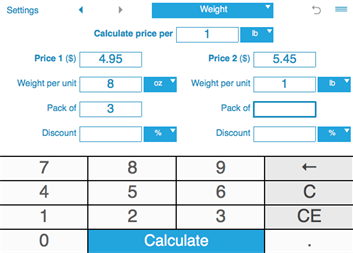 Simply enter the prices, quantities and sizes for comparable products and tap Calculate. To calculate the price with the Sales Tax, just set it in the Settings window. Unit Price Calculator shows you the better deal and your savings.