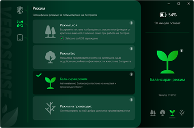 Приложението предоставя на потребителите режими, от които да избират. Производителност, Балансиран, Eco и Eco+. VeroSense е не само икономичен, но и насочен към потребителите, с лесен за употреба интерфейс и полезна информация, за да покажете, че полагате усилия за планетата Земя.