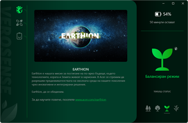 VeroSense е вграден софтуер на Acer за подпомагане на целите на потребители, които опазват природата, като пестене на енергия за удължаване на живота на батерията.