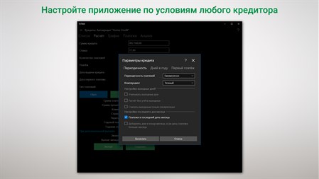Различные кредиторы могут использовать разные условия при расчетах займов. Для учета разных условий по кредитам в приложении существуют параметры кредита. Параметры кредита позволяют настроить приложение для вычислений по условиям любого кредитного учреждения.