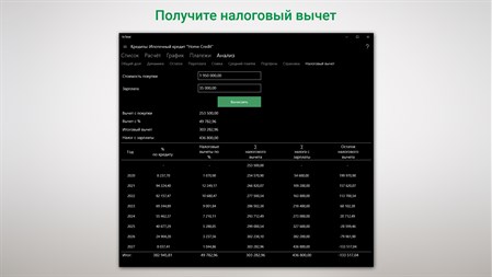 К основным возможностям приложения относятся: - Расчет кредитов с различными типами платежей – аннуитетный, дифференцированный, только проценты, без процентов (В разработке еще три метода для Американского континента) - Расчет графика платежей с периодичностью от одного дня до года - Установка периодичности начисления, как простых, так и сложных процентов, от одного дня до года - Учет досрочных платежей в уменьшение срока и уменьшение суммы кредита - Изменение процентной ставки кредита (рефинансирование) - Внесение любых изменений в график платежей с целью анализа различных условий и добавления поправок кредитора - Учет пропущенных платежей - Учет комиссии и страховки - Учет дополнительных расходов, в том числе в графике платежей - Расчет ежегодной страховки и налогового вычета для ипотечных кредитов - Учет кредитов в любой валюте, с возможностью изменять курс валюты - Поддержка ввода отрицательных значений - Расчет экономии - Подготовка отчетов и диаграмм - Сохранение созданных кредитов - Экспорт данных (в Excel)