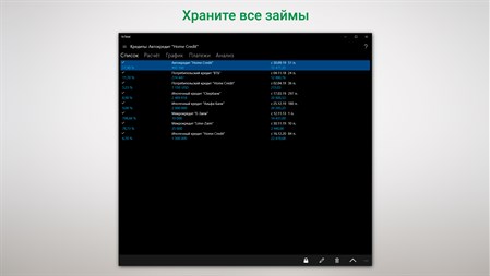 Основным назначением приложения является: - Расчет, анализ и учет кредитов, займов, ссуд - Аудит займов полученных у кредитора - Предоставление отчетов в виде скалярных значений, таблиц и диаграмм - Моделирование различных сценариев кредитной нагрузки заемщика - Получение максимальной выгоды как от управления отдельным займом, так и от управления всем портфелем кредитов - Сохранение вычисленных данных и экспорт данных (в Excel)