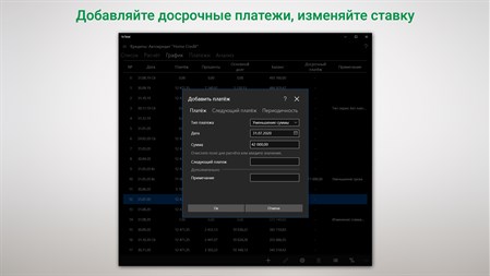 Учет досрочных платежей и рефинансирование, комиссий, страховки и дополнительных расходов, с возможностью внесения любых изменений в график платежей, делают приложение гибким инструментом расчета, анализа и учета займов. Так же имеется возможность вести учет кредитов в любой валюте, с возможностью изменять курс валюты. Широкий диапазон режимов вычислений и функционала, вместе с высокой точностью расчетов делает приложение мощным вычислительным инструментом позволяющим решать любые существующие задачи в области учета кредитов, займов, ссуд, а также достигать максимальной экономической выгоды от управления долгом.
